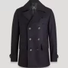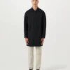 Modern, streamlined coat style with archival detail references