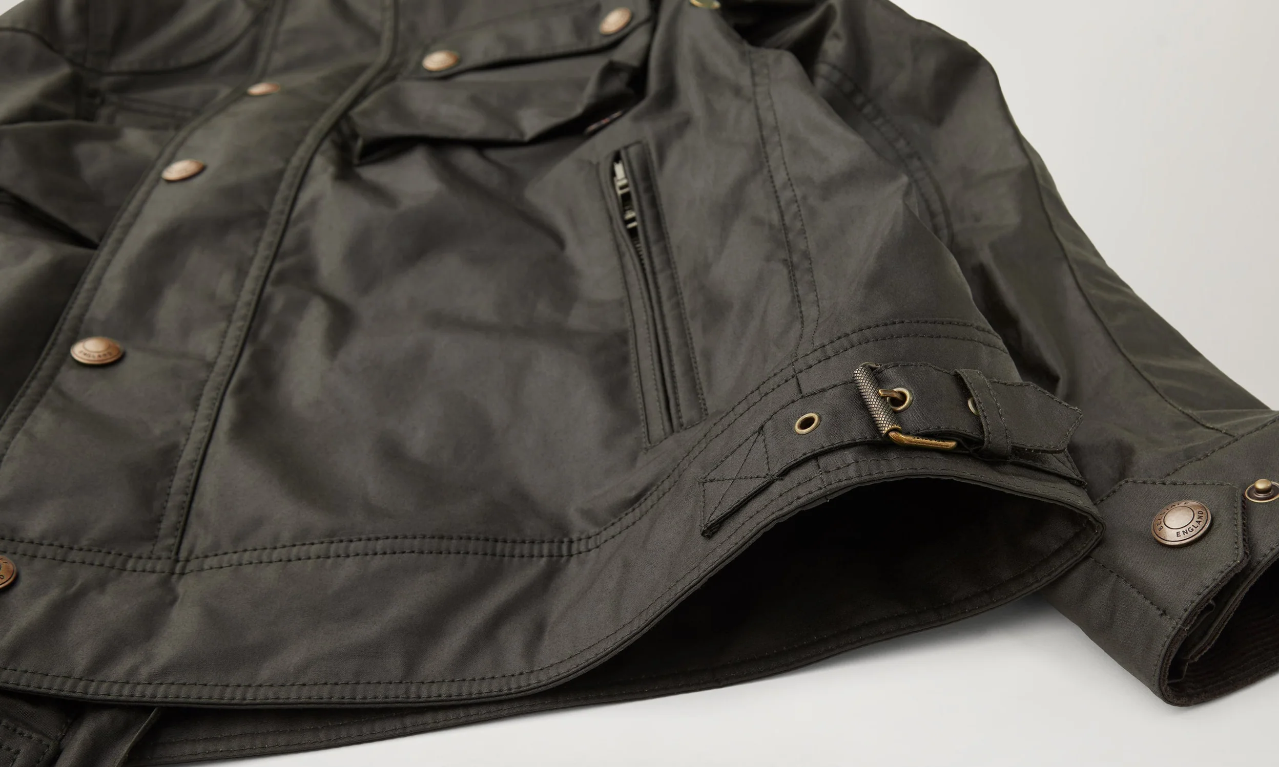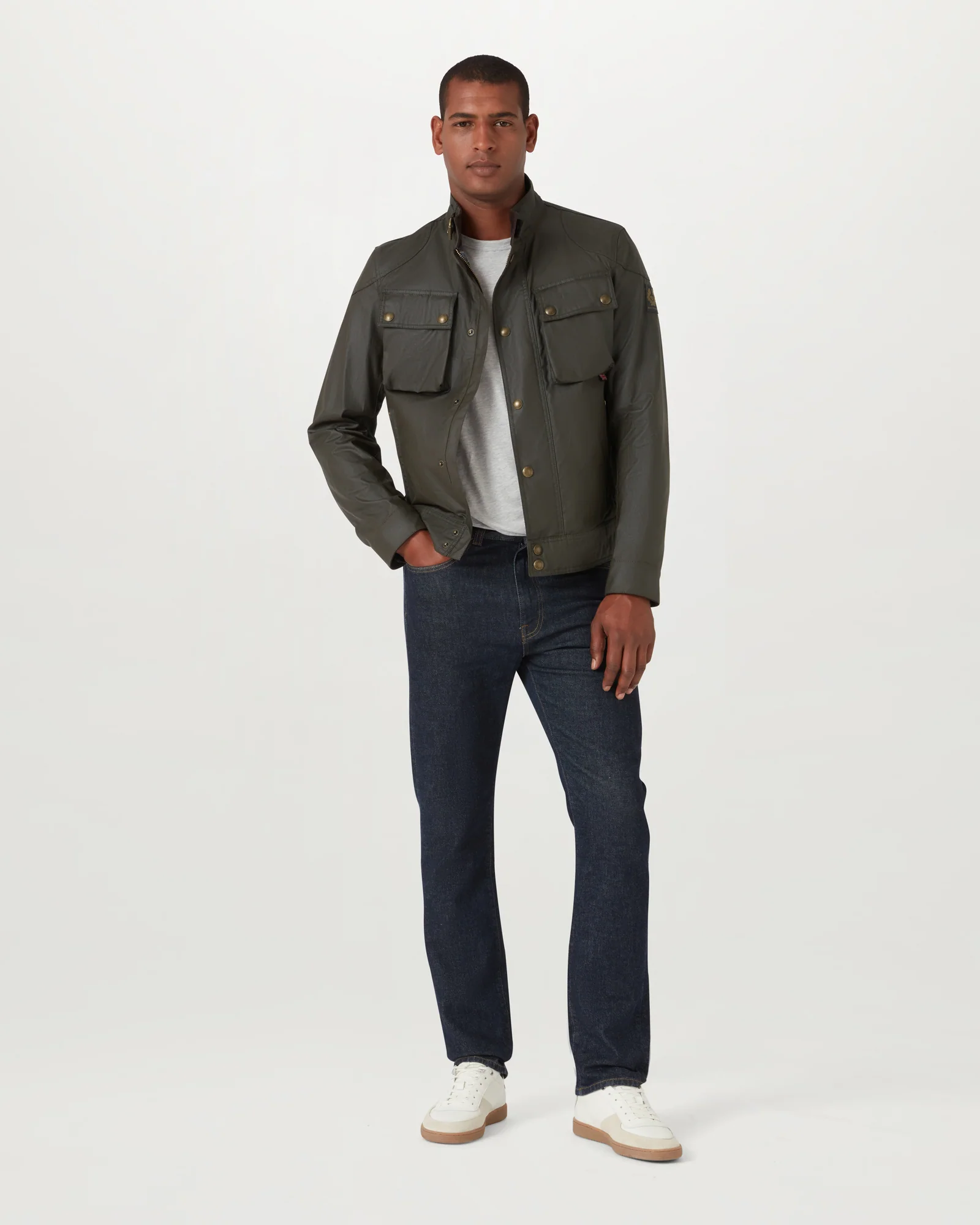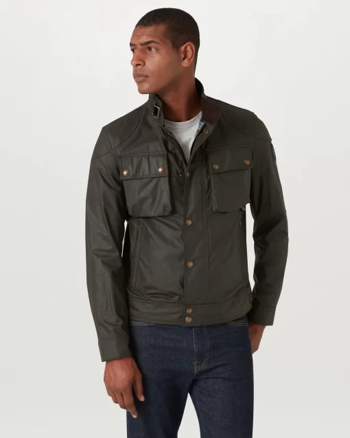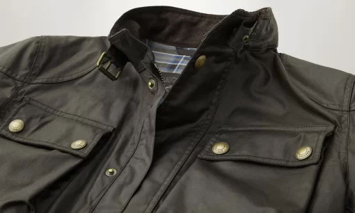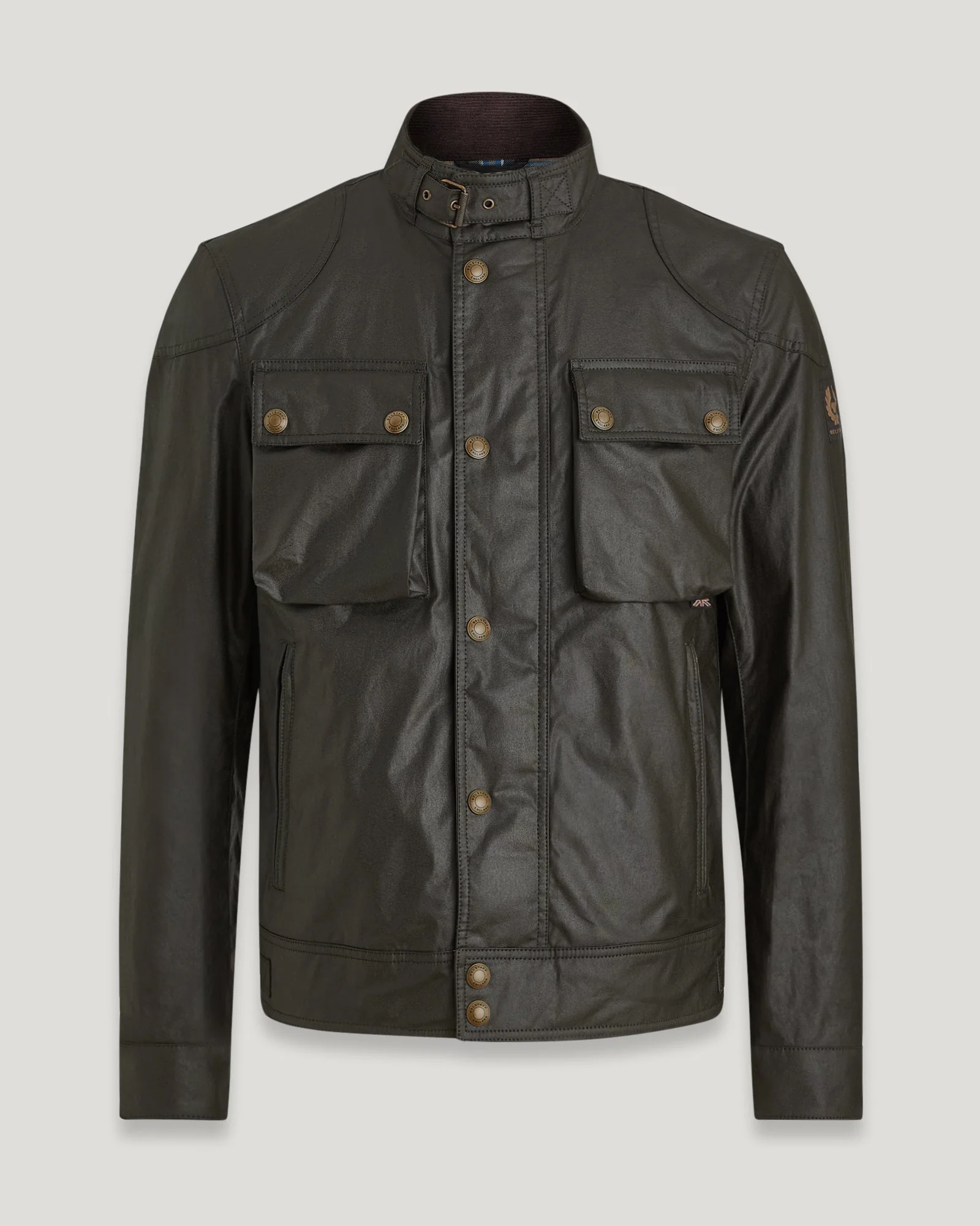 Signature antique brass metal hardware with Belstaff England engraved on the round and signature phoenix woven patch on left sleeve